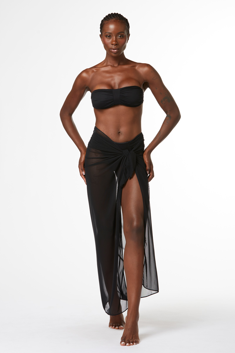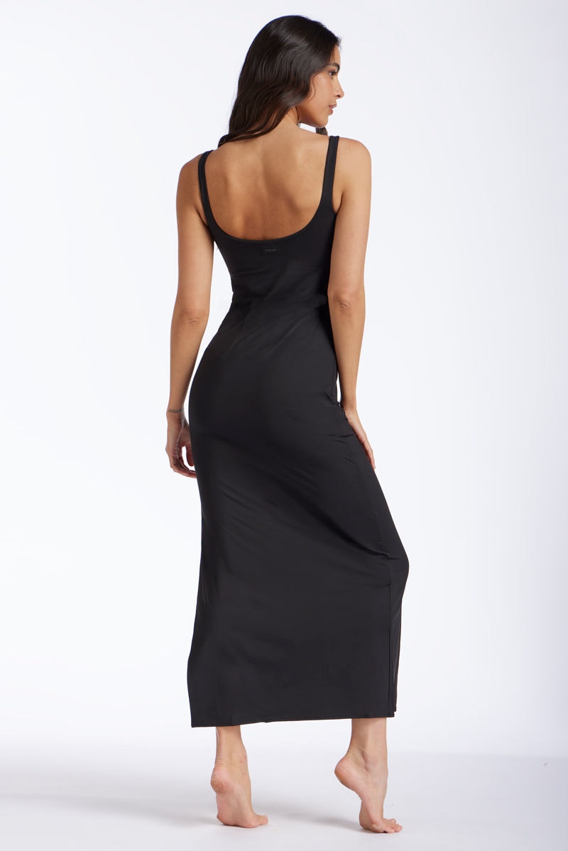 Abito lungo in microfibra tinta unita, con scollo quadrato e spacco laterale.