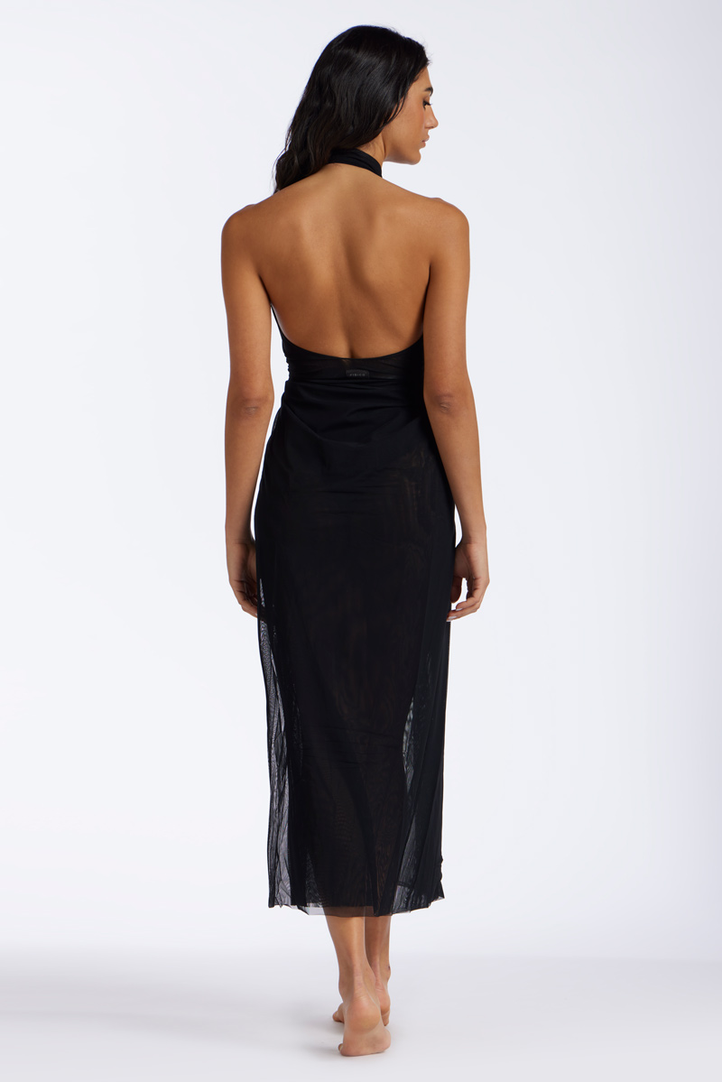 Copricostume in tulle leggero con profondo scollo all'americana. Arricchito da una fibbia ad anello dorata sul décolleté.