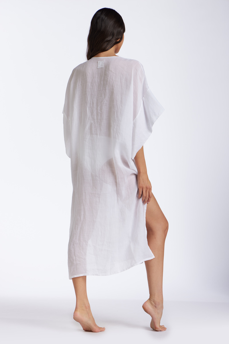 Kaftano lungo in lino tinta unita con ampie maniche, scollo a V e laccetti regolabili sul davanti.