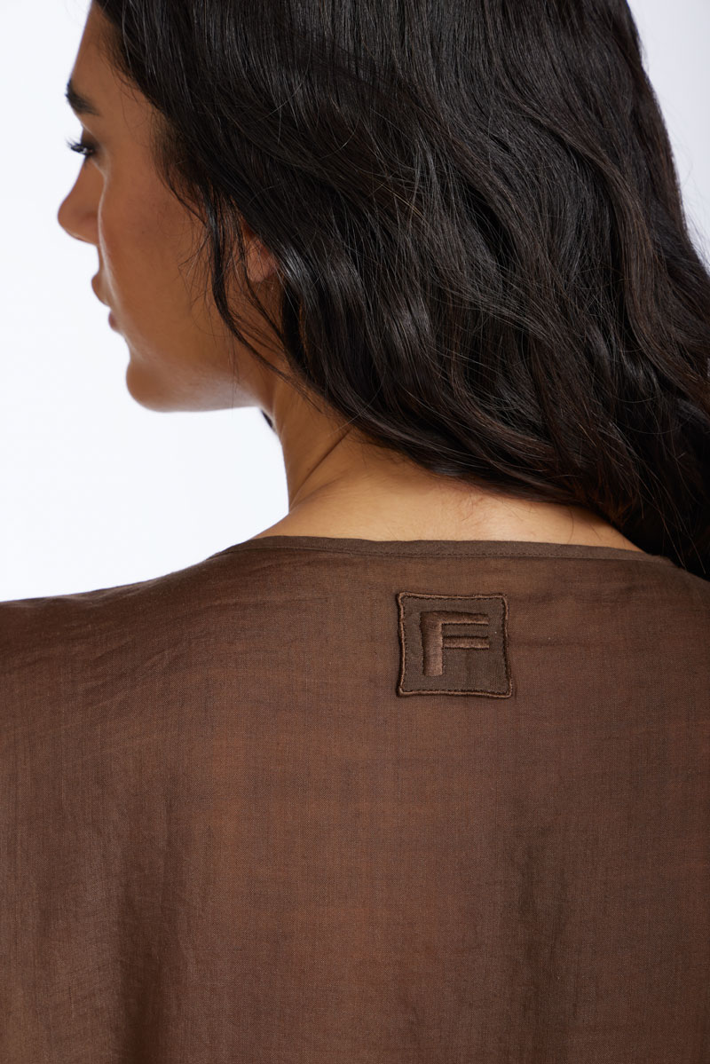 Kaftano lungo in lino tinta unita con ampie maniche, scollo a V e laccetti regolabili sul davanti.