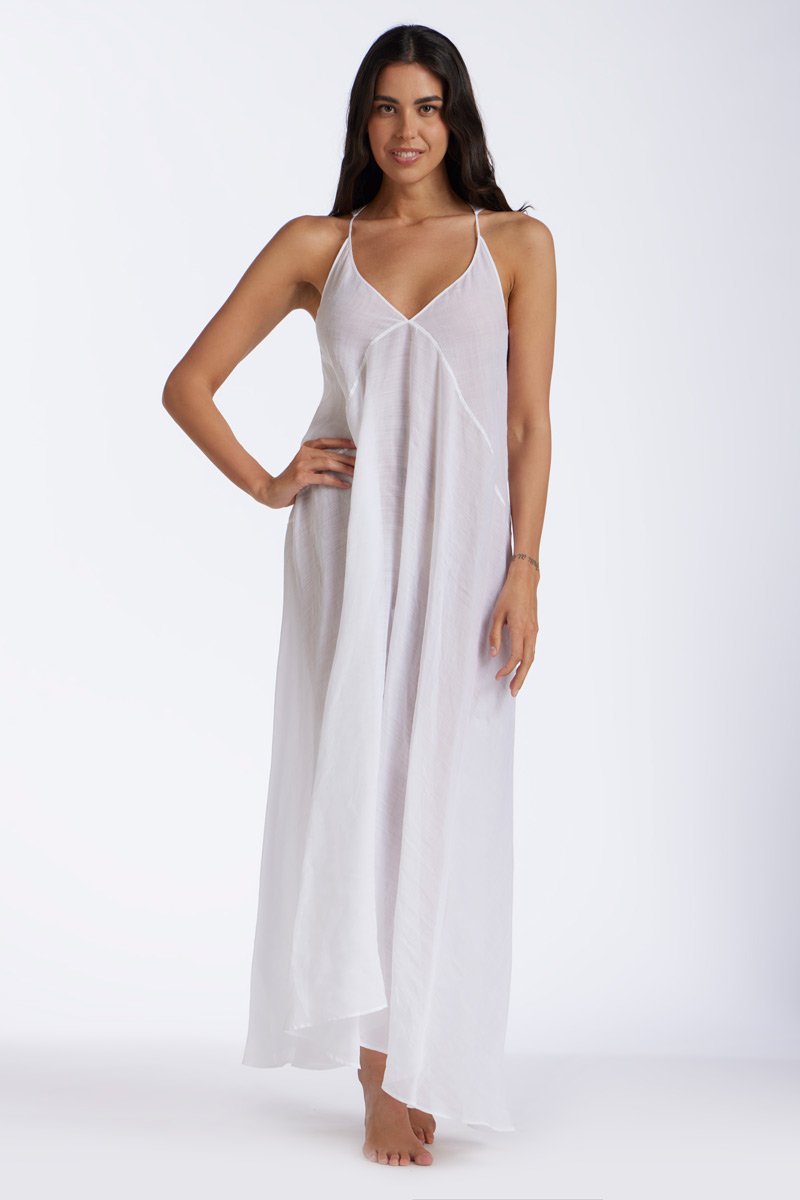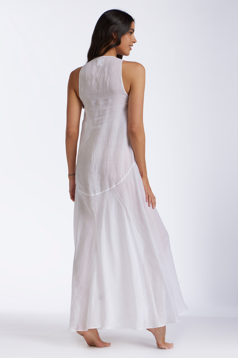 Maxi dress ampio e leggero in lino tinto capo, con scollo a V.