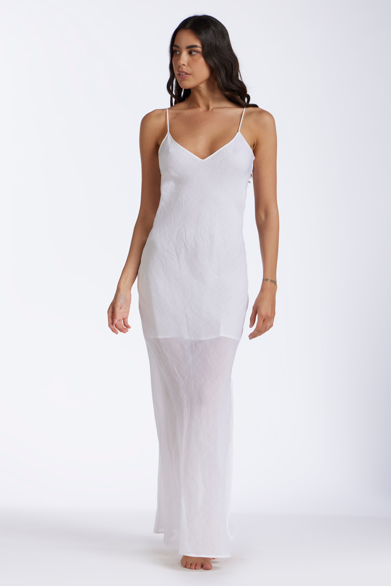Slip dress lungo in lino tinto capo, con profondo scollo a V e spalline sottili.