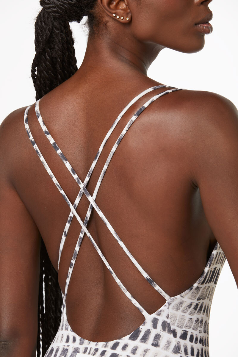 Animal print microfiber one-piece swimsuit with a straight neckline and removable cups, featuring double criss-cross shoulder straps at the back.