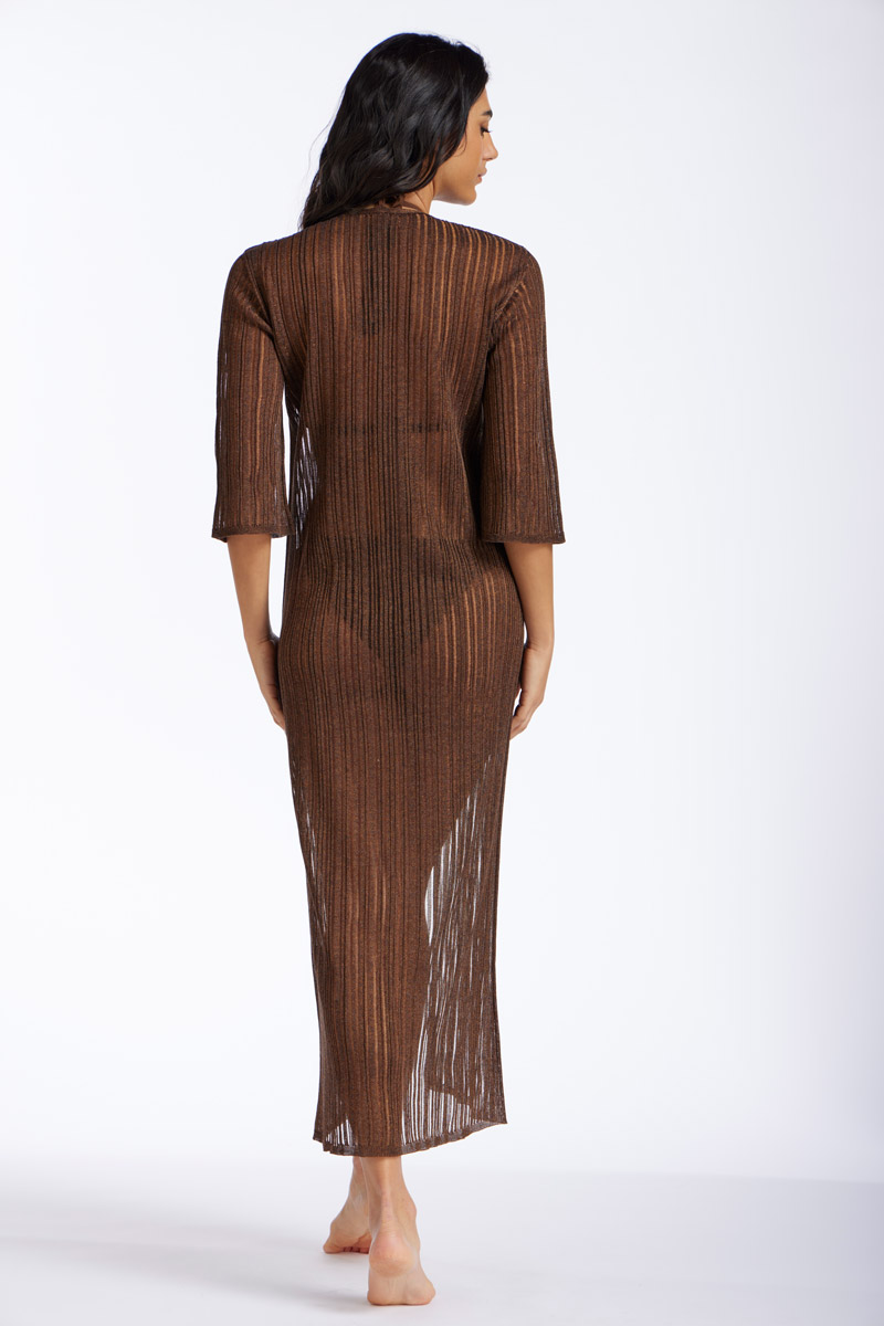 Open cardigan, made of airy viscose lurex rib knit. Featuring a three-quarter sleeve and ties closure.