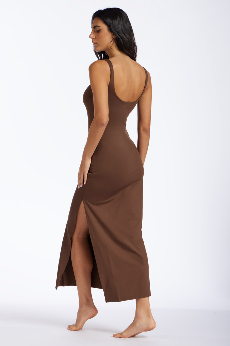 Solid-color microfiber dress, featuring a square neckline and tall side slit.
