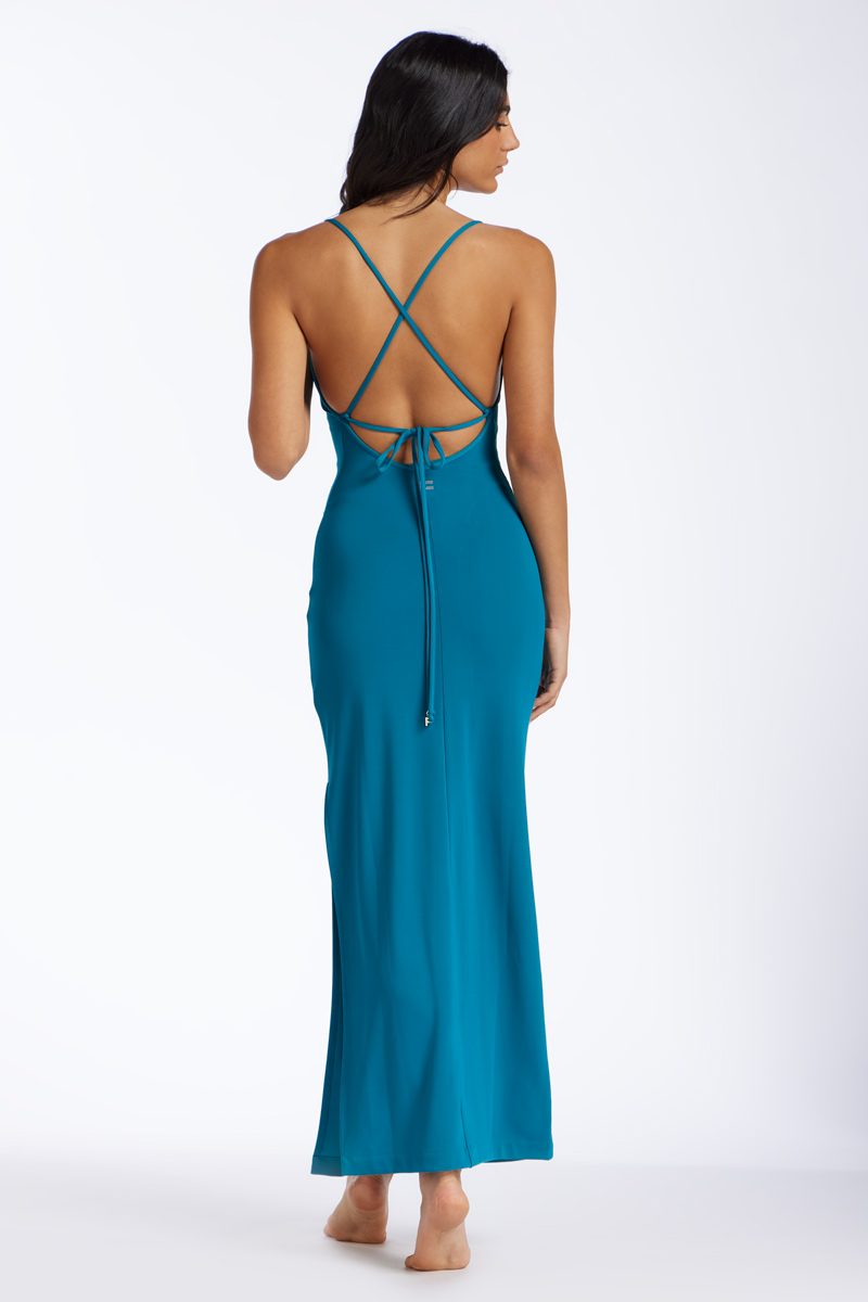Long fitted dress in solid-color jersey, with a straight neckline and thin straps that cross at the back.