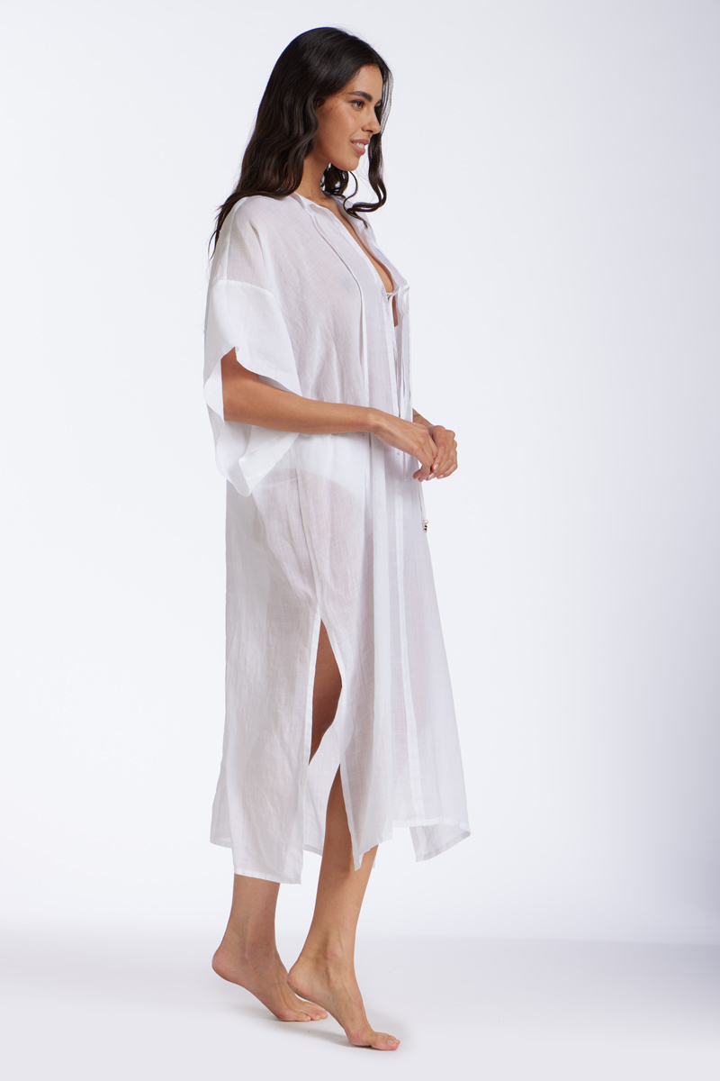 Solid colour linen long kaftan with wide sleeves and V-neck, with adjustable ties on the front.