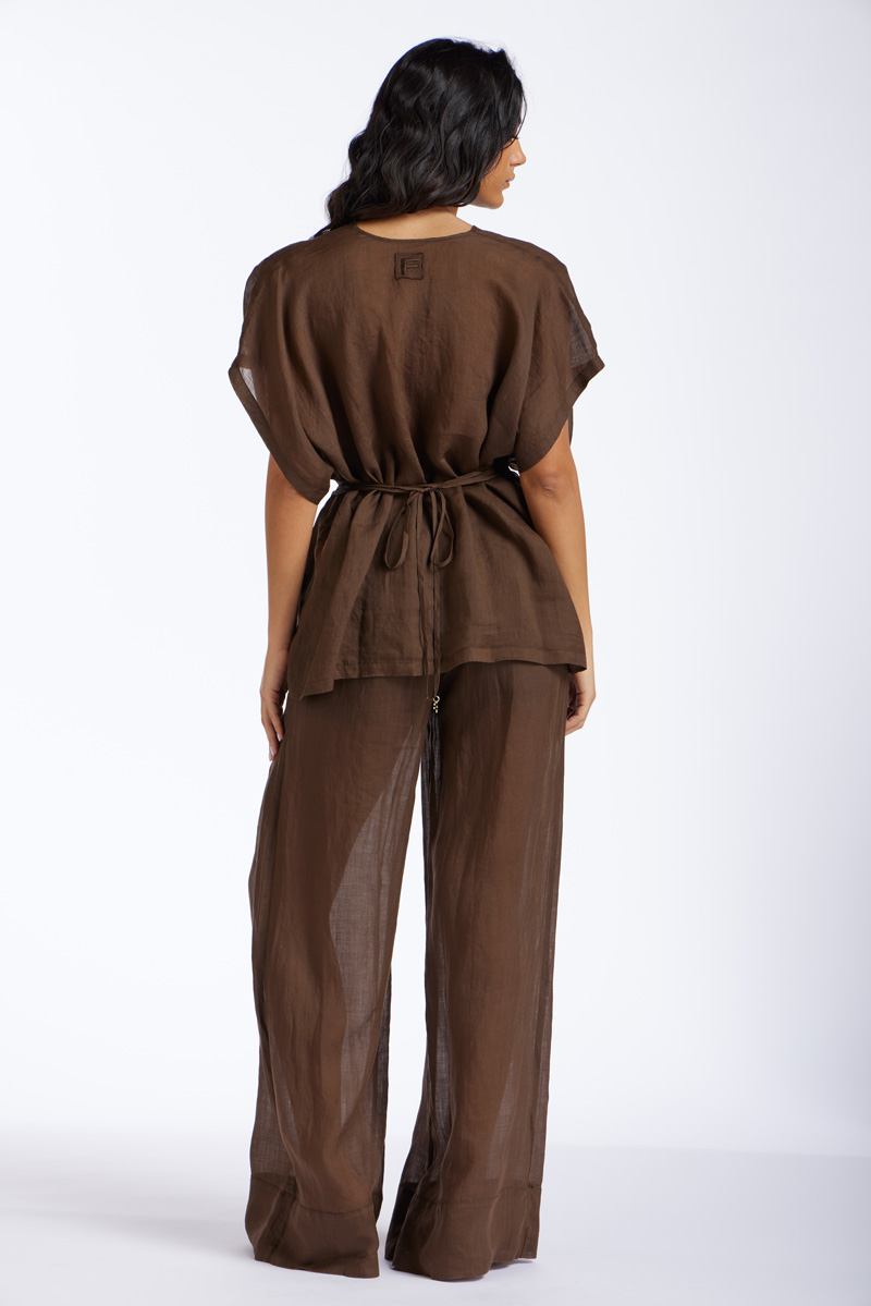 Solid colour linen palazzo trousers with wide leg and drawstring at the waist.