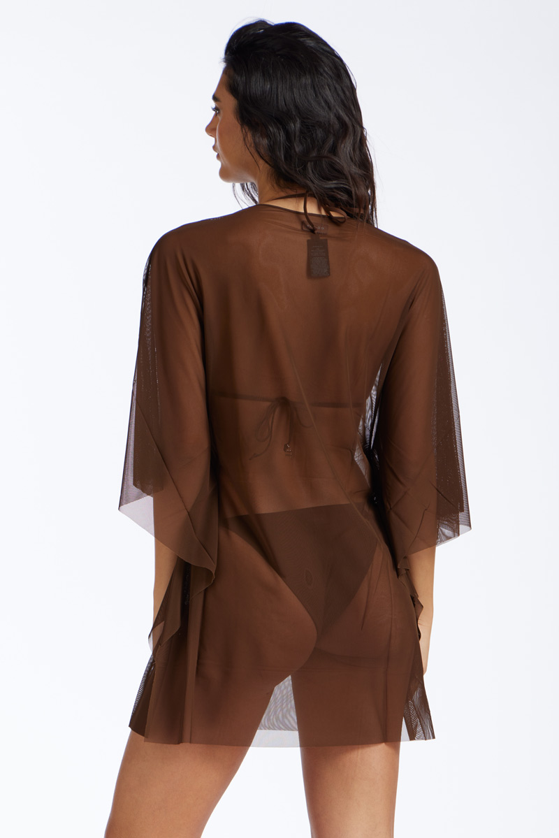 Solid colour tulle poncho featuring a V-neckline and wide bat sleeves.