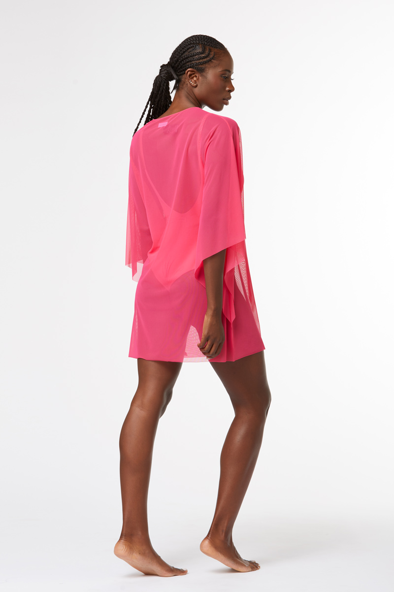 Solid colour tulle poncho featuring a V-neckline and wide bat sleeves.