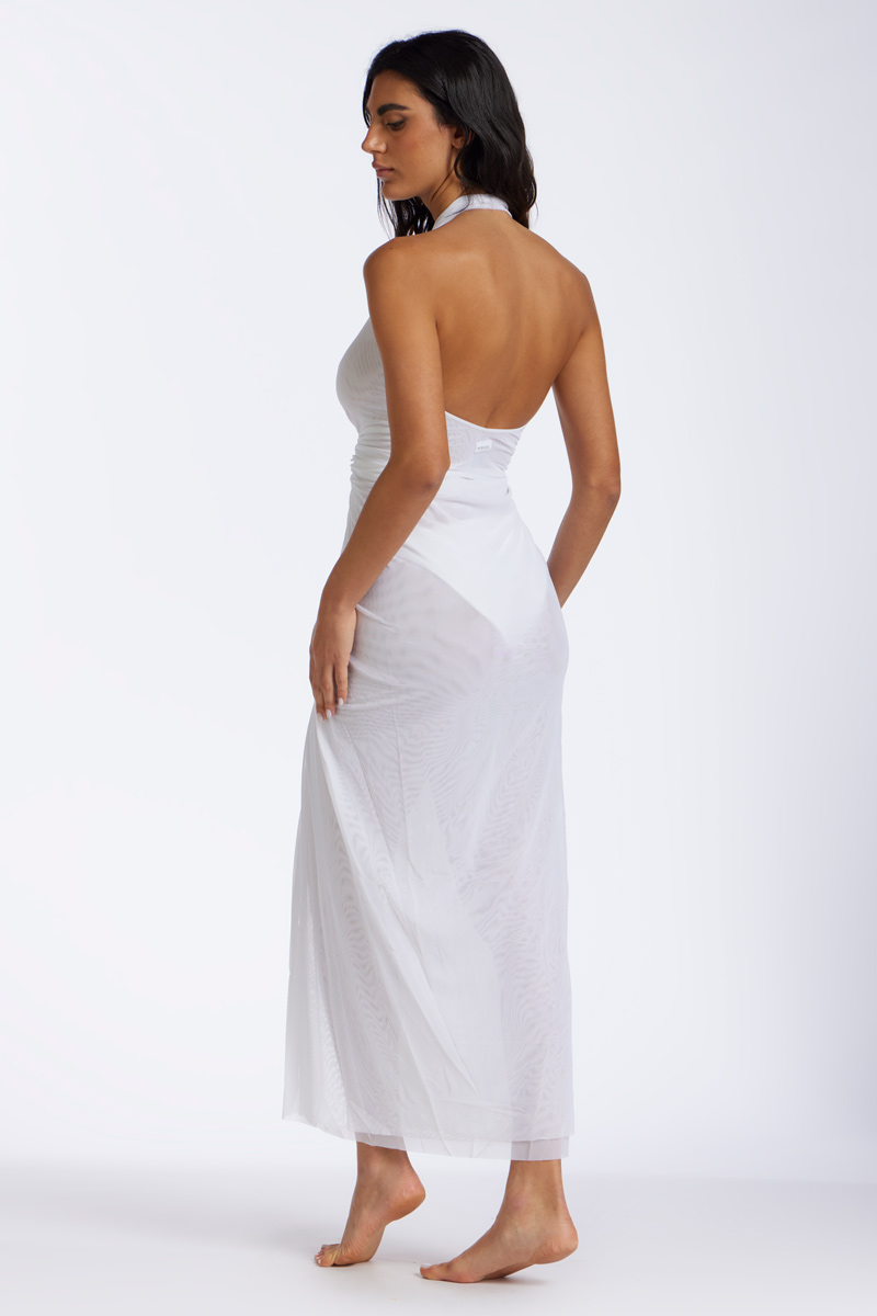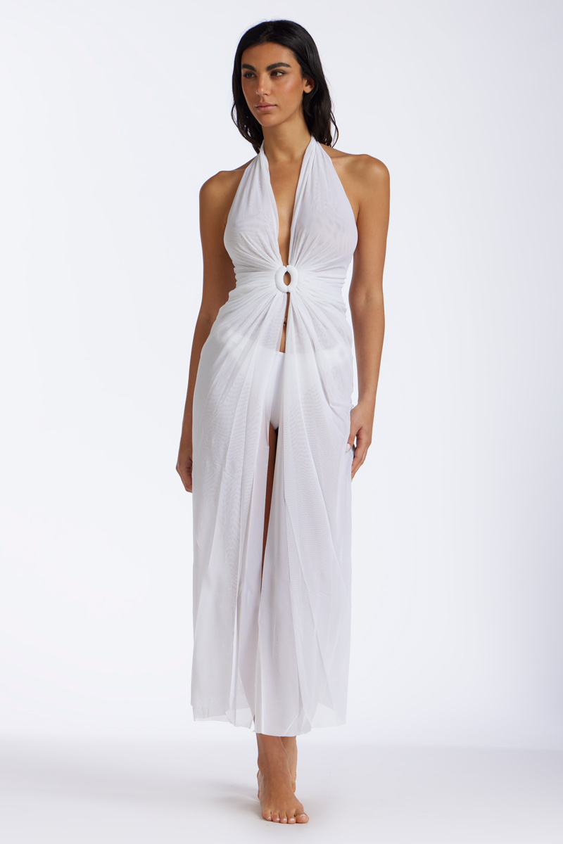 Lightweight tulle swimsuit cover-up with a deep halter neckline, enhanced by a golden ring detail at the décolleté.